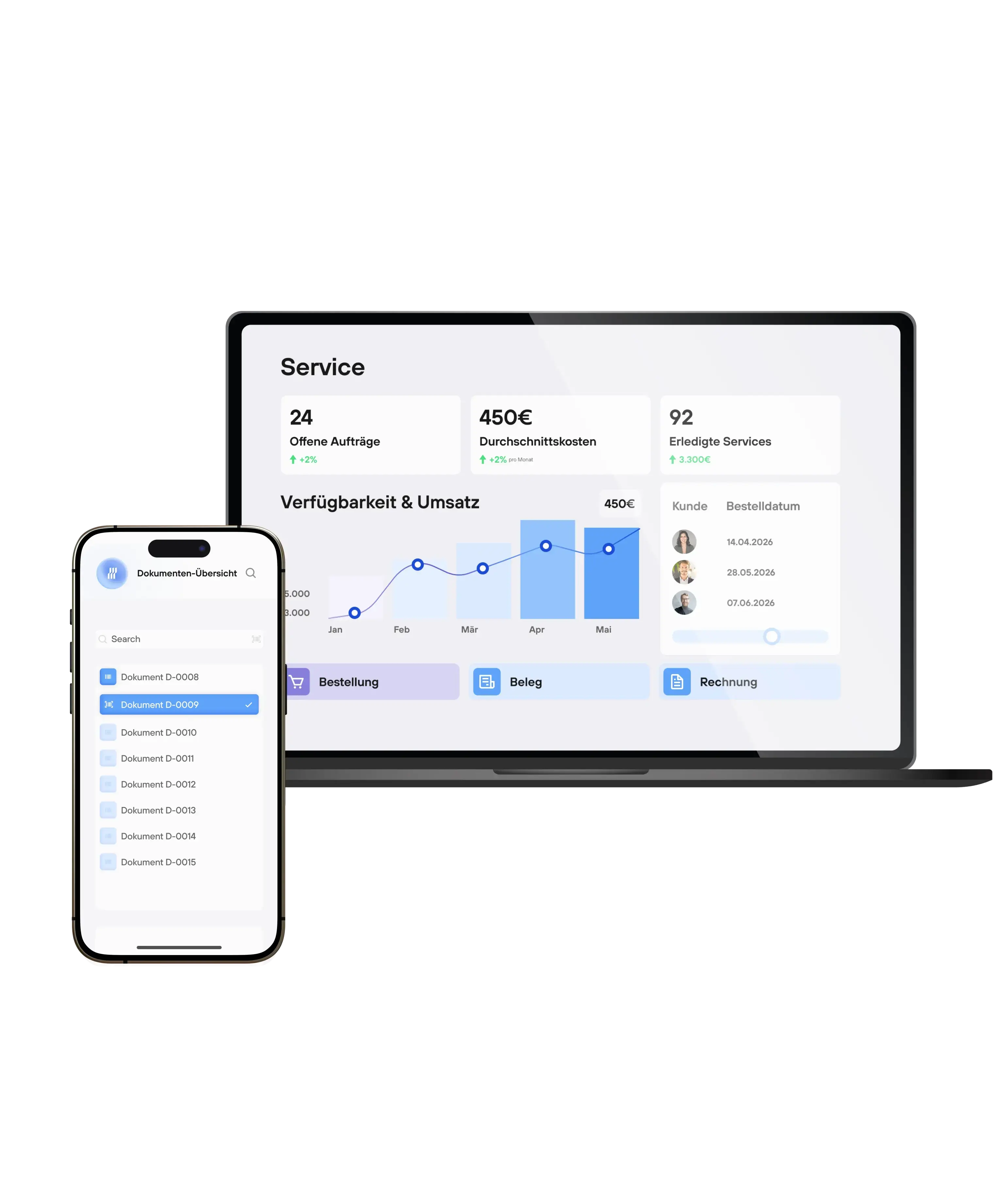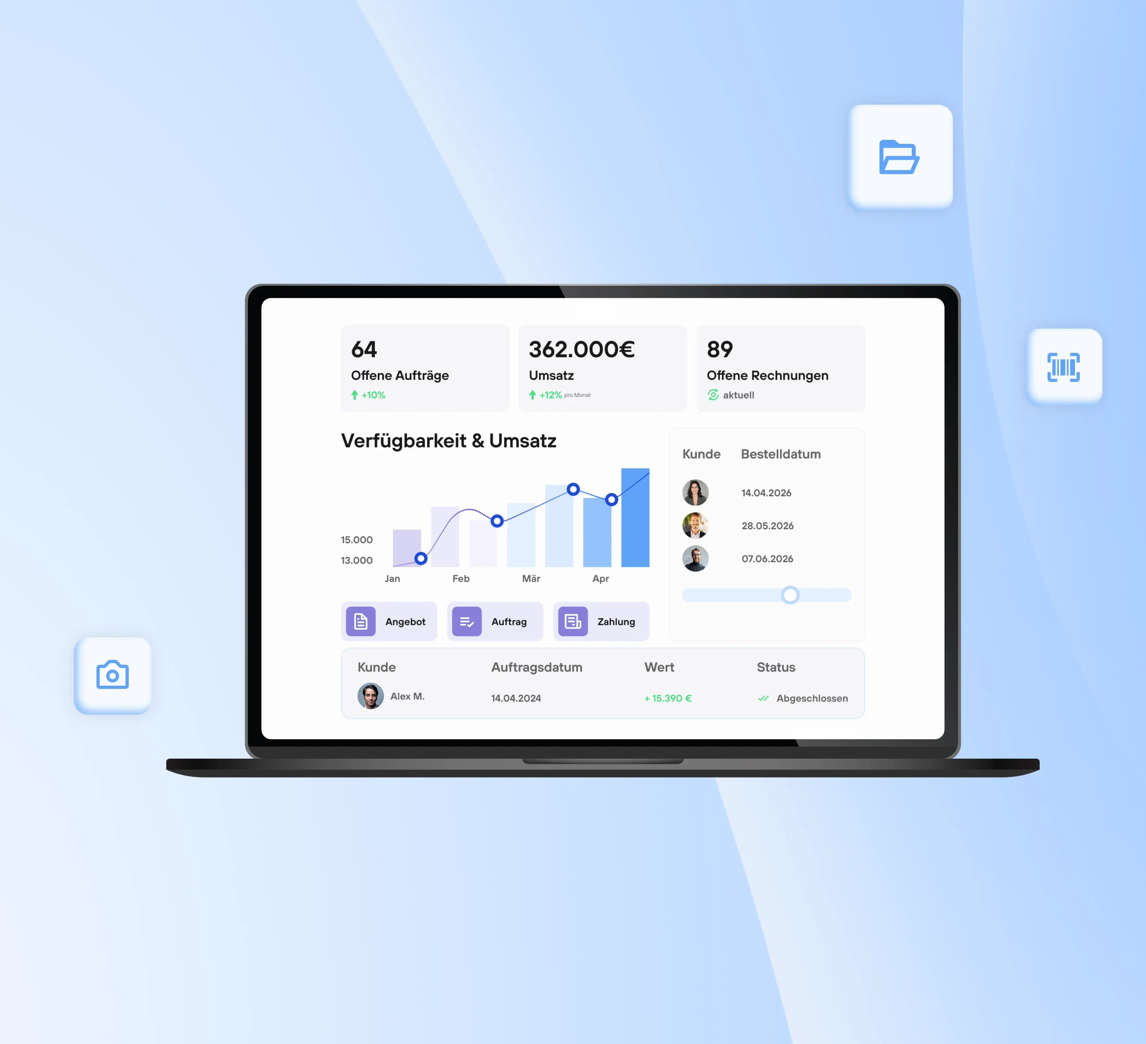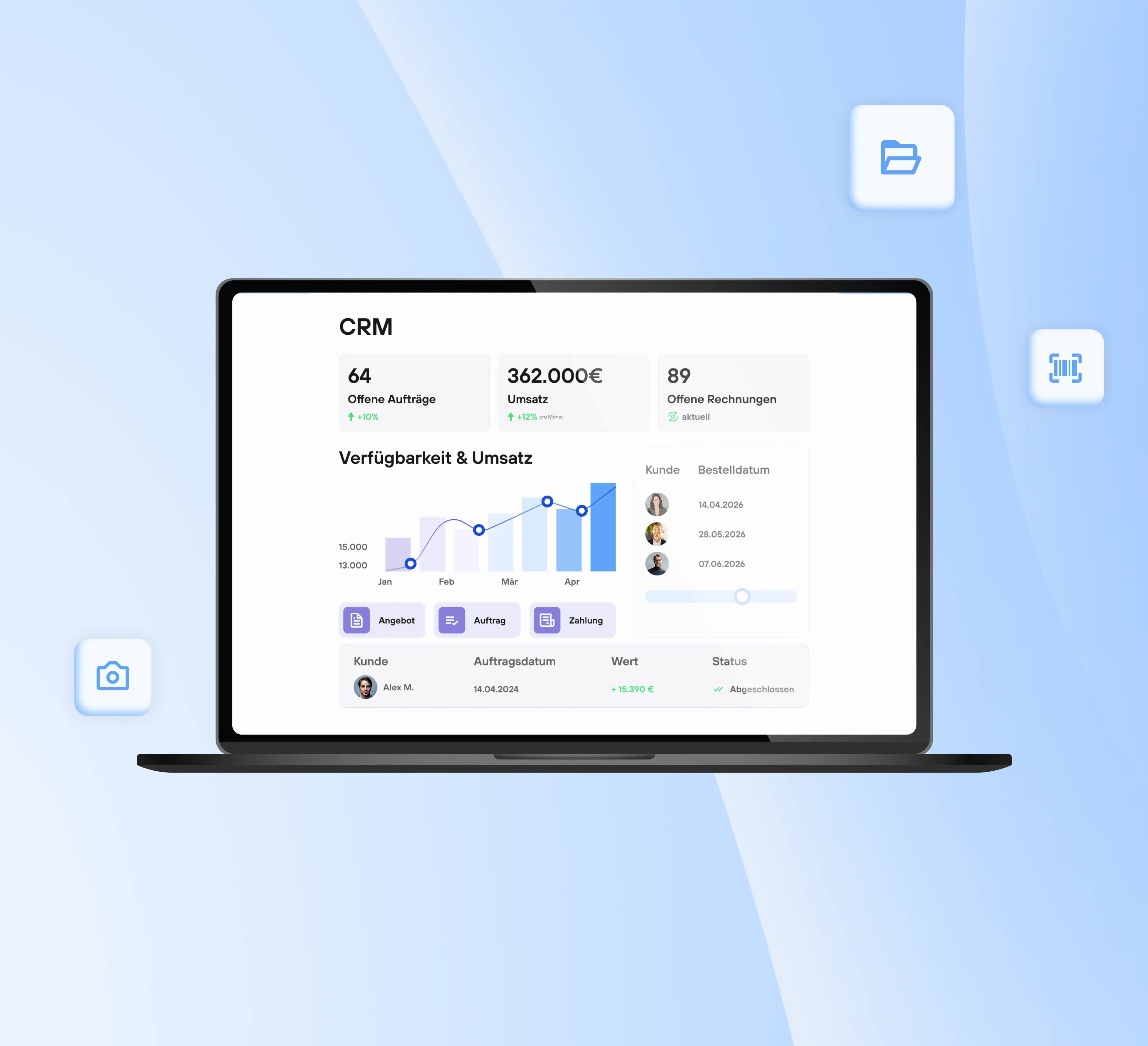 Geben Sie Ihrem Außendienst alle Daten an die Hand. Greifen Sie mobil auf Kundendaten, wie ERP-Informationen und DMS Belege zu, erfassen Sie Besuchsberichte und lassen Sie Aufträge direkt auf dem Tablet per digitaler Unterschrift signieren.